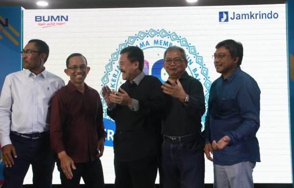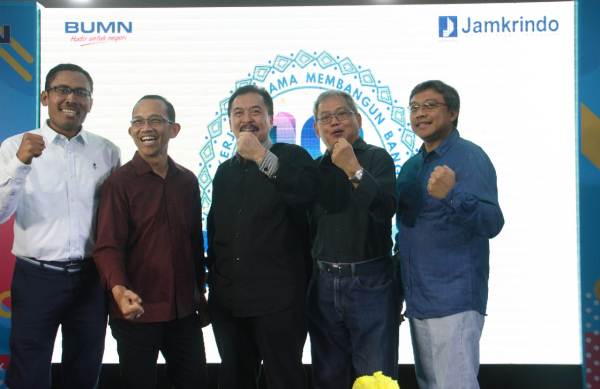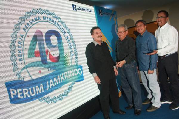 Direktur Utama Perum Jamkrindo Randi Anto (kiri) bersama Jajaran Direksi Perum Jamkrindo melakukan launching logo Hut ke-49 di Kantor Pusat Perum Jamkrindo, Jakarta, Jumat 3 Mei 2019. Rangkaian HUT ke-49 yang jatuh pada 1 Juli 2019, dimulai dari kompetisi Jamkrindo Hackathon Challenge yang merupakan kompetisi hack marathon bertema Guarantee Technology. Pada tahun ini Perum Jamkrindo mengambil tema HUT “Bekerja Bersama Membangun Bangsa”.