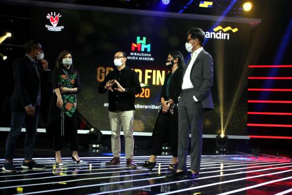CEO & Founder Investree Adrian Gunadi, Co-Founder Narasi Najwa Shihab, Direktur Jaringan & Retail Banking Bank Mandiri Aquarius Rudianto, Pekerja Seni dan Aktivis Sosial Dian Sastrowardoyo serta Founder & CEO Syah Establishments Felly Irmansyah (kiri ke kanan) saat melakukan penjurian final secara virtual dan pengumuman pemenang kompetisi Wirausaha Muda Mandiri (WMM) 2020 di Jakarta, Jumat, 27 November 2020. Ajang tahunan yang kali ini menghasilkan 21 wirausaha terbaik dari lima kategori usaha tersebut merupakan bukti komitmen Bank Mandiri untuk terus mengembangkan ekosistem pelaku usaha kreatif dalam menggerakan ekonomi Indonesia. Tercatat total pendaftar WMM tahun ini adalah sebanyak 11.067 pelaku usaha muda dari berbagai lokasi di Indonesia.
