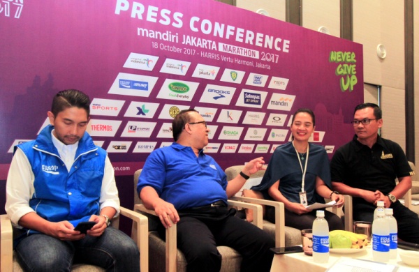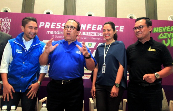 Chairman Jakarta Marathon Sapta Nirwandar (kedua kiri), VP Corporate Communications Bank Mandiri Maristella Tri Haryanti (kedua kanan), Marketing Director Pocari Sweat Daniel Pieter (kiri), CEO Inspiro Ndang Mawardi (kanan) tengah berbincang usai membuka press conference Mandiri Jakarta Marathon 2017 di Jakarta (18/10).