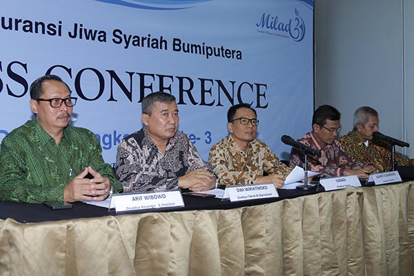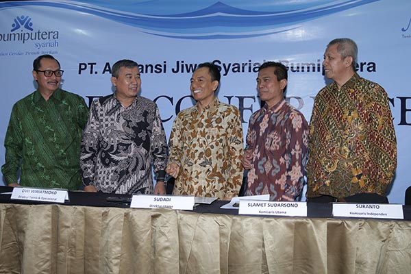 Direktur Utama PT Asuransi Jiwa Syariah Bumiputera Sudadi (tengah) bertumpu tangan dengan Direktur Keuangan dan Investasi Arif Wibowo, Direktur Teknik dan Operasional Dwi Wiriatmoko, Komisaris Utama Slamet Sudarsono dan Komisaris Independen Suranto (kiri ke kanan) sesaat sebelum konperensi pers terkait milad ke 3 Asuransi Jiwa Syariah Bumiputera yang diadakan di Jakarta, Senin 2 September 2109. Pencapaian pada tahun ke-3 beroperasi, pada Juli 2019, PT Asuransi Jiwa Syariah Bumiputera melakukan pengembangan distribusi agency. Pada perayaan Milad Asuransi Jiwa Syariah Bumiputera tahun ini dengan mengusung tema,“tumbuh dan kuat di atas kemandirian”.