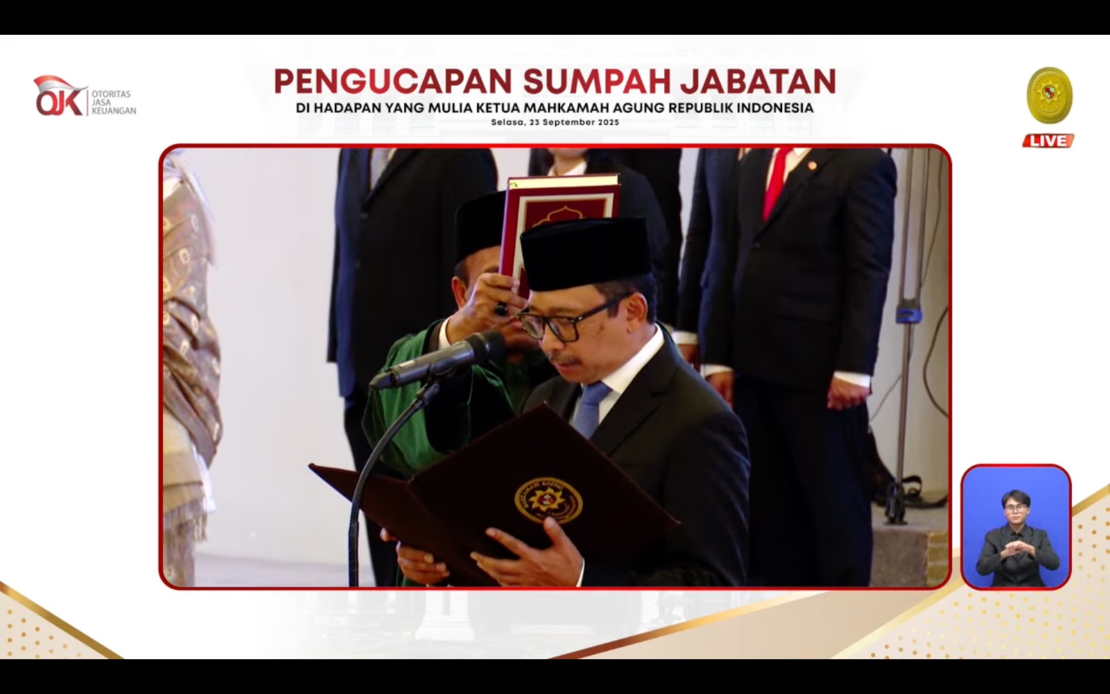 “Sebelum memangku jabatan Anggota Dewan Komisioner OJK Ex-officio dari BI, saudara wajib mengucapkan sumpah. Bersediakah saudara mengucapkan sumpah jabatan menurut agama dan kepercayaan anda?,” tanya Ketua MA Sunarto, Selasa, 23 September 2025.