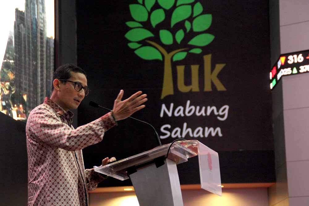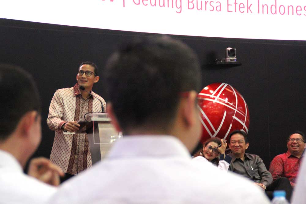 Wakil Gubernur DKI Jakarta Terpilih (2017-2022) Sandiaga Uno berikan kata sambutan pada acara Sosialisasi Go Public di Bursa Efek Indonesia,Jakarta,Senin 24 Juli 2017.Dalam rangka upaya BEI kerjasama dengan Kadin untuk mendukung dan mendorong perusahaan di Indonesia agar maju dan berkembang melalui pasar modal dengan melakukan go public.Sosialisasi Go Public ini mengambil tema “Akselerasi Pertumbuhan Perusahaan dan Investasi Cerdas melalui Pasar Modal Indonesia.(Budi Urtadi)