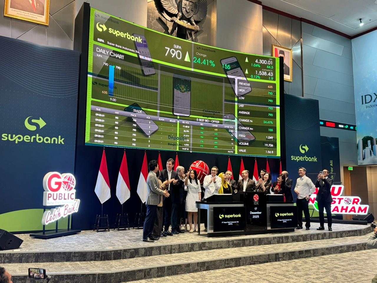 Jakarta – PT Super Bank Indonesia Tbk atau Superbank (IDX: SUPA) resmi mencatatkan saham perdananya di Bursa Efek Indonesia (IDX), Rabu, 17 Desember 2025.