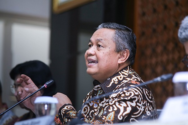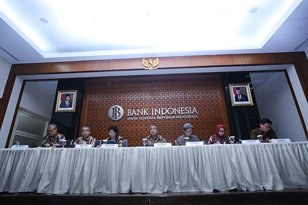 Gubernur Bank Indonesia (BI) Perry Warjiyo (tengah) didampingi anggota dewan gubernur lainnya memberikan keterangan pers mengenai stabilitas moneter dan pasar keuangan di Jakarta, Senin, 2 Maret 2020.Bank Indonesia menempuh beberapa langkah kebijakan lanjutan untuk menjaga stabilitas moneter dan pasar keuangan, termasuk memitigasi risiko COVID-19. Salah satunya adalah meningkatkan intensitas triple intervention agar nilai tukar rupiah bergerak sesuai dengan fundamentalnya dan mengikuti mekanisme pasar dengan mengoptimalkan strategi intervensi di pasar DNDF, pasar spot, dan pasar SBN guna meminimalkan risiko peningkatan volatilitas nilai tukar Rupiah. Menurunkan rasio Giro Wajib Minimum (GWM) Valuta Asing Bank Umum Konvensional, dari semula 8 persen menjadi 4 persen yang berlaku mulai 16 Maret 2020.