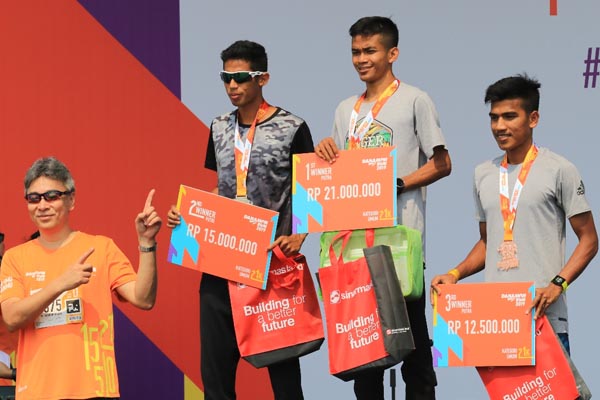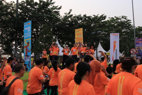 Direktur Utama Bank Danamon, Yasushi Itagaki (kanan) mengibarkan bendera saat melepas peserta lomba lari Danamon Run 2019 yang diadakan di Kawasan ICE BSD, Tangerang, Banten, Minggu 10 November 2019. PT Bank Danamon Indonesia Tbk (Bank Danamon) menggelar Danamon Run 2019, ajang lari andalan Bank Danamon yang tahun ini memasuki perhelatan ketiganya. Acara ini turut digelar sebagai bentuk persembahan Bank Danamon di Hari Pahlawan yang bertepatan pada 10 November.