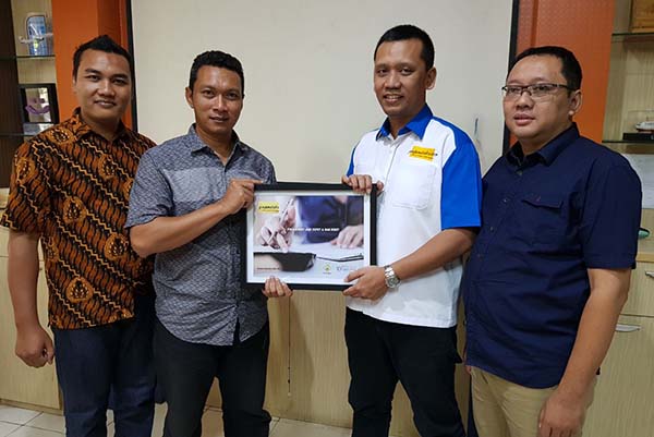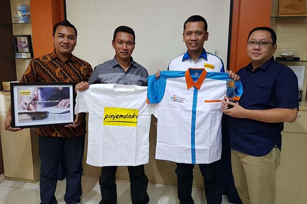 Co-founder dan CEO Arthasera Teknologi (dua dari kanan) selaku pengelola Pinjemdoku Budhi Pariyesana bertukar cenderamata dengan founder dan CEO Bimasakti selaku pengelola Fastpay Ibnu Sunanto (dua dari kiri), disaksikan Direktur Komersial Bimasakti Didin Noor Ali (kiri) dan Direktur Arthasera Teknoligi Gembong Prakoso (kanan) saat acara penandatanganan aliansi strategis yang dilakukan di Sidoarjo, Senin, 30 April 2018. Kerjasama ini melengkapi layanan yang dimiliki Bimasakti yang telah memiliki izin sebagai penyelenggara uang eletronik dan penyelenggara payment gateway, sedangkan bagi Pinjemdoku, kerjasama ini menjadikannya sebagai fintech lending aggregator dengan jaringan terluas di Indonesia.(*)