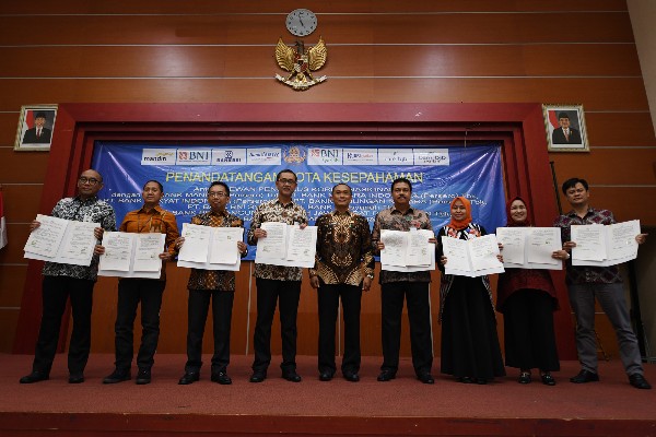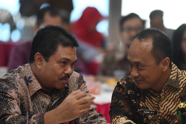 Direktur PT Bank Tabungan Negara (Persero) Tbk. Budi Satria (kanan) berbincang dengan Ketua Umum Dewan Pengurus Korps Pegawai Negeri Republik Indonesia (KORPRI) Nasional, Zudan Arif Fakrulloh (tengah) usai menandatangani Memorandum of Understanding (MoU) atau Nota Kesepahaman Penyediaan Jasa dan Layanan Perbankan di Jakarta, Jumat (4/1). Lewat MoU tersebut Bank BTN membidik potensi pembiayaan perumahan bagi sekitar 4,3 juta anggota Korpri baik dengan skema KPR Subsidi maupun non subsidi. Selain itu Bank BTN juga mengejar fee based income dengan memberika fasilitas layanan jasa perbankan lainnya seperti pengelolaan dana kelembagaan, fasilitas transaksional dan pengelolaan keuangan institusi/lembaga baik dalam bentuk giro, deposito serta bengelolaan rekening gaji dan tunjangan kinerja bagi anggota KORPRI (*)