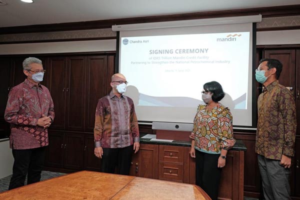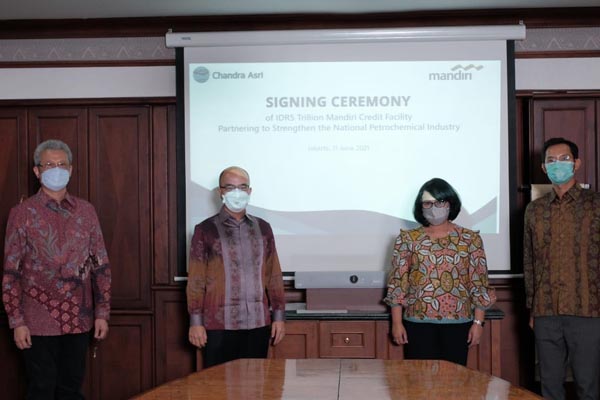 Direktur PT Chandra Asri Petrochemical Tbk, Suryandi (kiri) bersama Direktur Keuangan Andre Khor (dua kiri) dan Direktur Corporate Banking PT Bank Mandiri (Persero) Tbk Susana Indah K. Indriati (dua kanan) bersama Senior Vice President Corporate Banking Helmy Afrisa Nugroho (kanan) menandatangani kerja sama fasilitas pembiayaan senilai total ekuivalen Rp5 triliun antara Chandra Asri dengan Bank Mandiri di Jakarta, Jumat 11 Juni 2021. Chandra Asri mendapatkan fasilitas term loan dari Bank Mandiri senilai USD280 juta atau sekitar Rp4 triliun (kurs Rp14.285 per dollar AS) bertenor selama 7 tahun dan fasilitas account receivables financing dengan total limit sebesar Rp1 triliun bertenor 2 tahun yang akan digunakan untuk membiayai operasional Perseroan dalam rangka menunjang rencana ekspansi jangka panjang dan memperkuat pertumbuhan industri petrokimia nasional.
