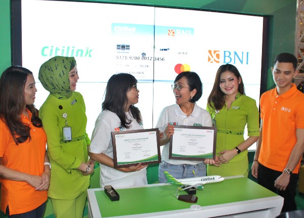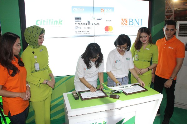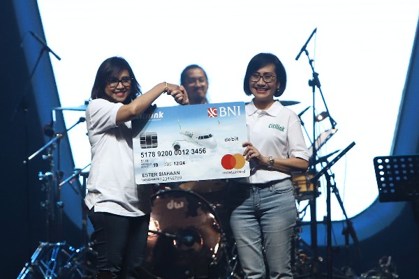 Direktur Retail Banking BNI Tambok P Setyawati (kanan) bersama Direktur Keuangan Citilink Indonesia Esther Siahaan (kiri) menunjukkan mock up Kartu Debit BNI Citilink kepada pengunjung BNI Java Jazz Festival 2019 di Jakarta, Sabtu, 2 Maret 2019. Dokumen kerja sama Co-Branding Kartu Debit BNI Citilink telah ditandatangani kedua belah pihak pada hari yang sama. (*)