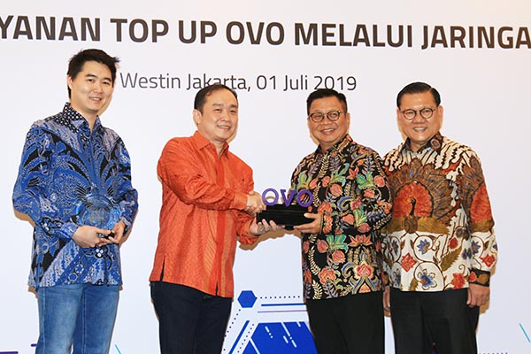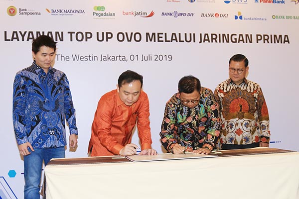 Presiden Direktur PT Rintis Sejahtera Iwan Setiawan (kedua kanan) bersama dengan Director of Enterprise Payment OVO Harianto Gunawan memegang naskah kerja sama disaksikan Marketing Director PT. Rintis Sejahtera Suryono Hidayat (kanan) dan Head of Analyst and Strategy Enterprise Payment OVO Stefen Loekito (kiri) usai penandatanganan kerja sama antara PT Rintis Sejahtera, pengelola Jaringan PRIMA dengan PT Visionet Internasional (OVO) tentang layanan top up OVO melalui jaringan PRIMA, di Jakarta, Senin 1 Juli 2019. Dengan kerja sama ini pengguna OVO dapat melakukan top up dari 10 bank mitra jaringan PRIMA. Menyusul berikutnya 22 Mitra Bank dan Non-Bank yang akan segera terhubung untuk layanan Top Up OVO di tahap selanjutnya.