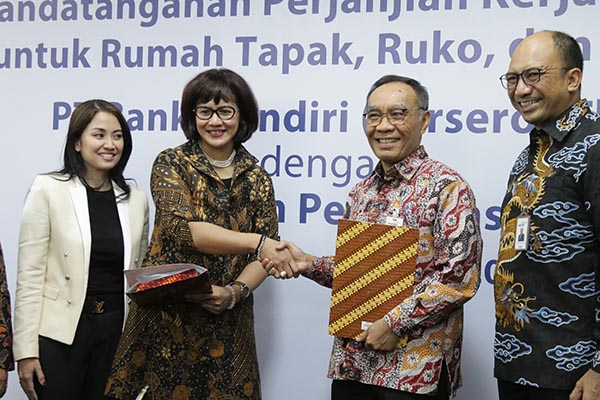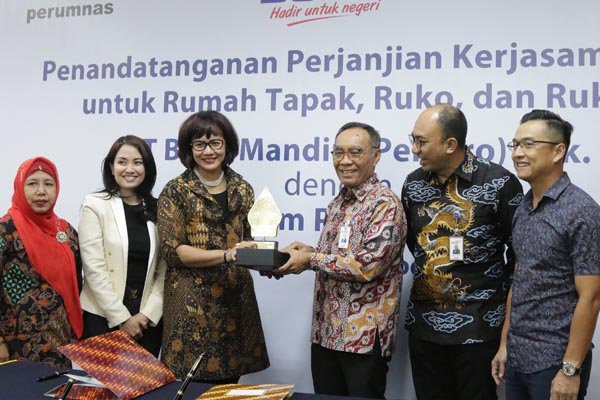 GM Penjualan Perumnas Sukasih, GM Pemasaran Perumnas Ari Kartika, Direktur Pemasaran Perumnas Anna Kunti Pratiwi, Direktur Retail Banking Bank Mandiri Donsuwan Simatupang, EVP Consumer Loans Bank Mandiri Ignatius Susatyo Wijoyo, SVP Consumer Credit Risk & Analytics Bank Mandiri Setiyo Wibowo (kiri ke kanan) tengah berbincang usai penandatanganan perjanjian kerja sama di Jakarta, Senin 23 September 2019. Bank Mandiri akan menyediakan jasa perbankan berupa fasilitas KPR untuk rumah tapak, Ruko dan Rukan kepada end-user dan first buyer di 45 proyek Perum Perumnas di berbagai lokasi di Indonesia dengan plafon pembiayaan yang disiapkan mencapai Rp 900 miliar. Kerjasama ini menawarkan sejumlah keuntungan antara lain suku bunga yang lebih kompetitif, proses yang lebih cepat (Instant approval) serta potensi mendapatkan hunian di lokasi idaman.