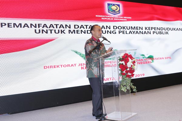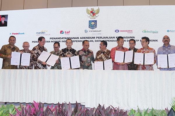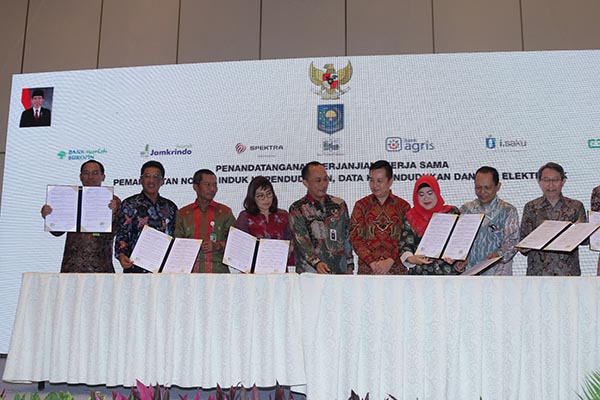 Direktur Jenderal Kependudukan dan Pencatatan Sipil Kementerian Dalam Negeri Republik Indonesia Zudan Arif Fakrulloh (paling kiri) tengah menyaksikan penandatanganan kerja sama pemanfaatan nomor induk kependudukan, data kependudukan dan KTP elektronik dengan 14 lembaga pelaku industri keuangan, bank maupun non bank yang dilakukan di Jakarta, Selasa 16 Juli 2019. Kerja sama ini dilakukan untuk akses pemanfaatan nomor induk kependudukan (NIK), data kependudukan dan KTP elektronik (KTP el). Hal ini dilakukan sebagai upaya peningkatan layanan kepada nasabah.