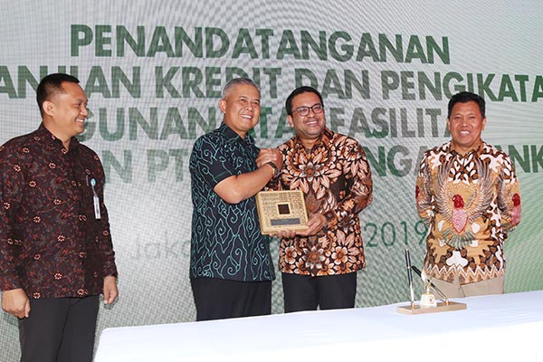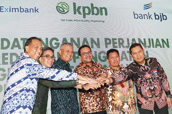 Senior Executive Vice President Komersial PT Bank Pembangunan Daerah Jawa Barat dan Banten Tbk Beny Riswandi (kedua kiri), saling berpegang tangan dengan Dirut PT Kharisma Pemasaran Bersama Nusantara (KPBN) Edward S. Ginting (kedua kanan) disaksikan Direktur Utama Holding Perkebunan Dolly Pulungan (kanan) dan Pemimpin Divisi Korporasi dan Komersial Bank BJB Dicky Syahbandinata seusai penandatanganan kerja sama pemberian fasilitas kredit dan security sharing agreement di Jakarta, Kamis 23 Mei 2019. Melalui kerja sama ini Bank BJB mendapatkan potensi untuk masuk ke usaha yang sejenis baik pemerintah maupun swasta, membuka peluang bisnis untuk bank BJB lebih besar.