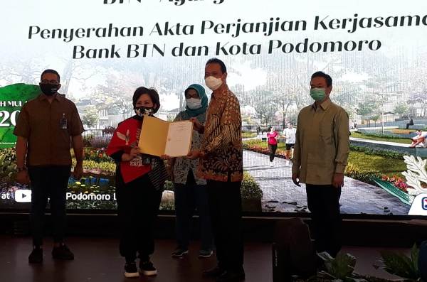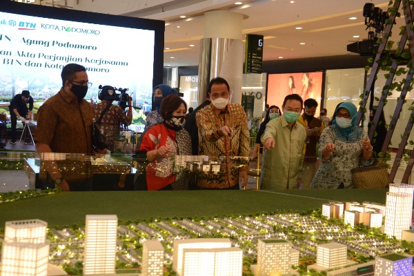 Mortgage Sales Department Head Bank BTN Romeo Daniel Menkeru Van Enst, Branch Manager Bank BTN Kacab Jakarta Kebon Jeruk, Executive Vice President Non Subsidize Mortgage and Personal Lending Division Bank BTN Suryanti Agustinar, Marketing Director Agung Podomoro Group Agung Wirajaya dan AVP Kota Podomoro Tenjo Zaldy Wihardja (kiri ke kanan) usai melakukan penandatanganan kerja sama antara Agung Podomoro Grup dengan Bank BTN dalam hal pembiayaan KPR proyek Kota Podomoro Tenjo yang dilakukan di Jakarta, Jumat 28 Agustus 2020. Group perusahaan properti terpercaya Agung PodomoroGroup (APG) memberikan solusi untuk masyarakat masa kini yang ingin hidup sehat. Mengusung konsep “Living in Style”APG menghadirkan produk properti terbaik terbarunya yaitu Mega Proyek Kota MandiriKota Podomoro Tenjo. Kerjasama ini juga merupakan bagian dari program Bank BTN Indonesia Property Expo 2020, di mana Kota Podomoro Tenjo turut berpartisi.