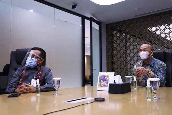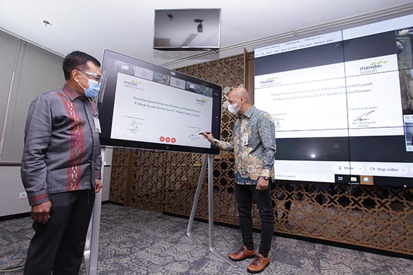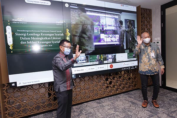 Direktur Mandiri Syariah Ade Cahyo Nugroho (kanan), SEVP Mandiri Syariah Karya Prasetya Budi (kiri) menyapa secara virtual Direktur Mandiri Utama Finance (MUF) Rita Mustika, Pejabat Executive MUF Yusuf Budi Baik dan SVP MUF Abdul Rochim usai penandatanganan kerja sama di Jakarta, Senin 14 September 2020. Mandiri Syariah dan Mandiri Utama Finance menjalin sinergi memperluas layanan pembiayaan kepemilikan kendaraan (otomotif) dengan skema syariah. Kerjasama meliputi penyaluran pembiayaan secara joint financing, optimalisasi customer base, serta perluasan jaringan pemasaran MUF. Melalui kerjasama ini nasabah dapat mengakses pembiayaan syariah untuk kendaraan mobil baru, mobil bekas, dan motor baru di Mandiri Syariah dan Mandiri Utama Finance.