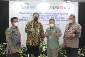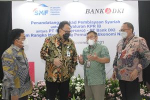 Direktur Utama PT Bank DKI Fidri Arnaldy (kedua kiri) berbincang bersama Direktur Utama PT Sarana Multigriya Finansial (Persero) Ananta Wigoyo (kedua kanan), Direktur Kredit UMK & Usaha Syariah Babay Parid Wazdi (kiri) dan Direktur PT Sarana Multigriya Finansial (Persero) Heliantopo, usai melakukan penandatanganan akad pembiayaan Syariah senilai Rp479 miliar untuk penyaluran KPR iB melalui skema replacement financing dengan Akad Mudharabah Muqayyadah antara Unit Usaha Syariah Bank DKI dengan PT Sarana Multigriya Finansial (Persero) di Jakarta, Rabu, 10 November 2021. Melalui kerja sama tersebut, diharapkan dapat semakin menguatkan semangat sinergi dan kolaborasi BUMD dan BUMN terutama dalam peningkatan akses perumahan kepada masyarakat.