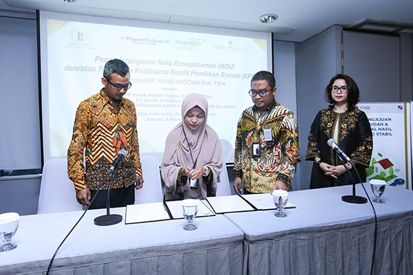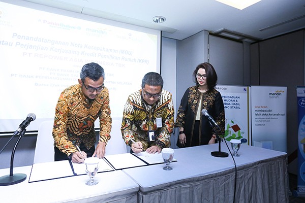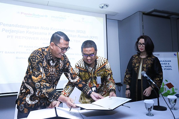 Area Manager Jakarta Kebon Jeruk Bank Syariah Mandiri Budi Abdiriva berbincang dengan Dirut PT Repower Asia Indonesia Tbk. Aulia Firdaus, Mortgage Partnership Manager Bank Panin Dubai Priyowibowo, dan Kepala Div. Kredit Bank Kalsel Marthin Jonathan (kanan ke kiri) di sela-sela penandatanganan kerja sama di Jakarta, Senin 2 Maret 2020. PT Repower Asia Indonesia Tbk. menambah mitra baru dalam kerja sama penyaluran kredit pemilikan rumah (KPR) yakni PT Bank Syariah Mandiri, PT Bank Panin Dubai Syariah Tbk., dan PT Bank Pembangunan Daerah Kalimantan Selatan, melengkapi empat bank lain yang sebelumnya telah digandeng Repower. Dengan bertambahnya bank yang menjadi penyalur KPR, Repower optimistis dapat memenuhi target penjualan tahun 2020 senilai Rp72,92 miliar.