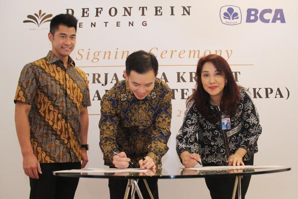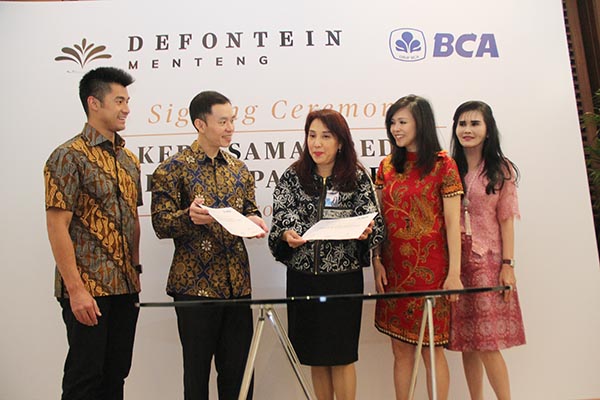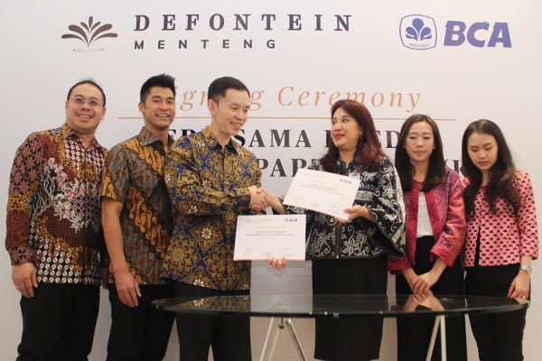 Direktur PT Bangun Inti Artha, Hendry Leo (ketiga kiri) dan Executive Vice President of Consumer Loan Division BCA Felicia Mathilda Simon (ketiga kanan) saling berjabat tangan disaksikan Direktur Wesley Wijaya (kedua kiri), Direktur Pikko Group, Alice Neonardi (kedua kanan), Direktur Steffie Neonardi (kanan) serta Senior Vice President of Consumer Loan Division BCA Frans Sjarifudin seusai menandatangani kerjasama Kredit Kepemilikan Apartemen Defontein di Jakarta. Kerjasama KPA BCA ini dimaksudkan untuk memudahkan konsumen dalam proses kepemilikan Apartemen Defontein di lokasi strategis dan prestisius Menteng Raya yang dikembangkan PT Bangun Inti Artha, konsorsium Pikko Group dengan Wijaya Wisesa Realty.