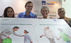 (Kiri-kanan) Chief of in Branch Channel – Tisye dyah retnojati, Presiden Direktur AXA Mandiri – Jean Philippe Vandenschrick, Direktur Utama Bank Syariah Mandiri – Agus Sudiarto dan Direktur Consumer Banking & Distribution- Edwin Dwi Djajanto saat peluncurkan asuransi pendidikan Unit link Mandiri Sejahtera Cerdas Syariah dan asuransi kesehatan Mandiri Proteksi Kesehatan Syariah.di Jakarta,Rabu 7 Oktober 2015.AXA Mandiri Financial Services (AXA Mandiri) yang berpengalaman di bidang perencanaan keuangan dan asuransi kesehatan,kembali memperkuat bisnis asuransi pada segmen syariah bekejasama dengan Bank Syariah Mandiri (BSM) melalui jalur bancassurance.(*)