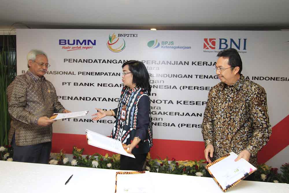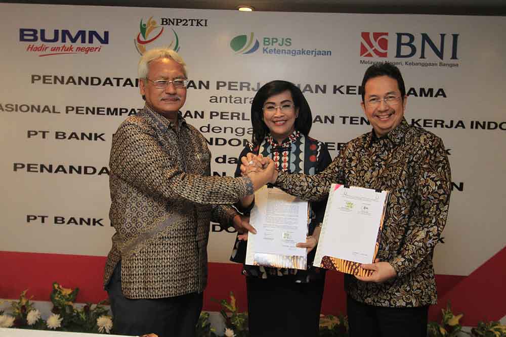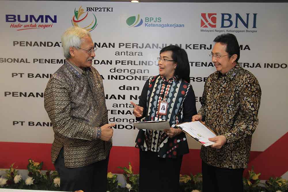 Direktur Hubungan Kelembagaan dan Transaksional Perbankan BNI Adi Sulistyowati (tengah) berbincang bersama Deputi Penempatan TKI BNP2TKI Agustin Subiantoro (kiri) dan Direktur Perluasan Kepesertaan dan Hubungan Antar Lembaga BPJS Ketenagakerjaan E Ilias Lubis (kanan) usai penandatanganan kerja sama di Jakarta, Senin 7 Agustus 2017. BNI bersama Badan Nasional Penempatan dan Perlindungan Tenaga Kerja Indonesia (BNP2TKI) dan BPJS Ketenagakerjaan bekerja sama untuk penerbitan Kartu Pekerja Indonesia (KPI) co-branding, Layanan Cash Management, fasilitas kredit untuk TKI dan layanan jasa perbankan guna mendukung Program Jaminan Sosial bagi TKI.