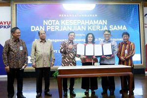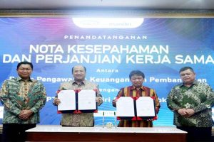 Direktur Utama Bank Mandiri Darmawan Junaidi (kiri) dan Kepala Badan Pengawasan Keuangan dan Pembangunan (BPKP) Muhammad Yusuf Ateh (kanan) menyaksikan Deputi Kepala BPKP Bidang Pengawasan Penyelenggaraan Keuangan Daerah Raden Suhartono (kedua kanan) dan Direktur Commercial Banking Bank Mandiri Riduan (kedua kiri) saat penandatanganan MoU dan Perjanjian Kerjasama di Jakarta, Selasa, 31 Mei 2022. Untuk memperkuat pengelolaan keuangan daerah, Bank Mandiri bersinergi dengan Badan Pengawasan Keuangan dan Pembangunan (BPKP) melakukan digitalisasi transaksi pencairan SP2D (Surat Perintah Pencairan Dana) melalui kanal Kopra Host to Host (Mandiri Corporate Payable) yang terintegrasi dengan aplikasi Sistem Informasi Manajemen Daerah (SIMDA) Next-G berbasis web milik BPKP atau lebih dikenal dengan Financial Management Information System (FMIS). Layanan ini akan dilengkapi dengan fitur validasi rekening penerima dana, pembuatan ID Billing & pembayaran Pajak melalui Modul Penerimaan Negara (MPN) secara real time dengan keamanan sistem yang terbaik.