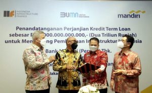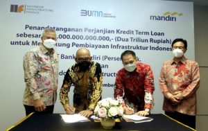 Direktur Hubungan Kelembagaan Bank Mandiri Rohan Hafas, SVP Government Institutional Bank Mandiri Dadang Ramadhan, Head of Treasury Division Indonesia Infrastructure Finance (IIF) Faridh H Muhsinin serta Presiden Direktur IIF Reynaldi Hermansjah (kiri ke kanan) usai menandatangani kerjasama fasilitas kredit senilai Rp 2 triliun untuk mendukung akselerasi pembangunan infrastruktur di Indonesia di Jakarta, Rabu, 17 November 2021. Fasilitas kredit dengan skema term loan ini rencananya akan digunakan untuk memenuhi kebutuhan pembiayaan infrastruktur yang berkelanjutan dengan jangka waktu empat tahun. Dukungan ini merupakan inisiatif Bank Mandiri untuk terus aktif dalam pengembangan proyek-proyek infrastruktur di Indonesia melalui lembaga keuangan pembiayaan infrastruktur yang memperhatikan keberlangsungan sosial dan lingkungan di sekitarnya.