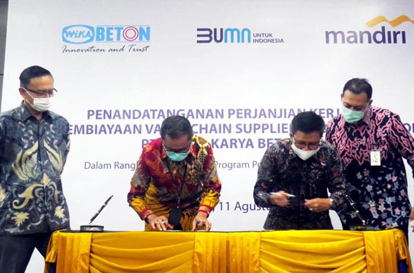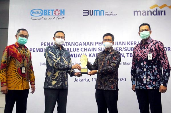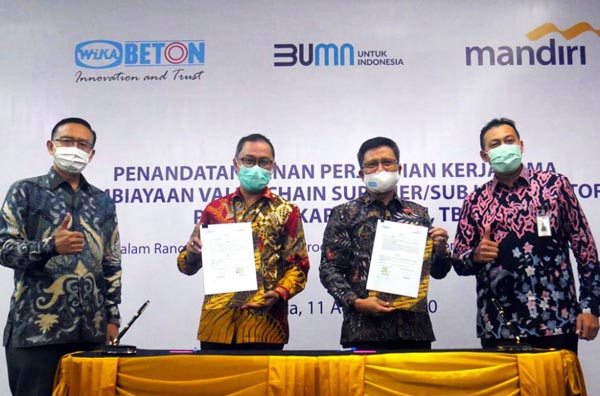 Pejabat Eksekutif Bisnis dan Jaringan Bank Mandiri Aquarius Rudianto, SVP Small & Medium Enterprise (SME) Banking Bank Mandiri Muhammad Iqbal, Direktur Keuangan PT Wijaya Karya Beton Imam Sudiyono, dan SVP Corporate Banking 2 Bank Mandiri Yusak L. S Silalahi (kiri ke kanan) saat menunjukkan perjanjian kerjasama di Jakarta, Selasa 11 Agustus 2020. Bank Mandiri menyiapkan fasilitas pembiayaan dengan plafon awal Rp250 miliar kepada UKM yang menjadi supplier/sub kontraktor PT Wijaya Karya (Wika) Beton untuk membantu pengembangan usaha. Kerjasama sinergis antar BUMN ini diharapkan dapat  mendukung program percepatan Pemulihan Ekonomi Nasional (PEN) dari dampak pandemi covid-19.