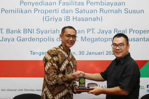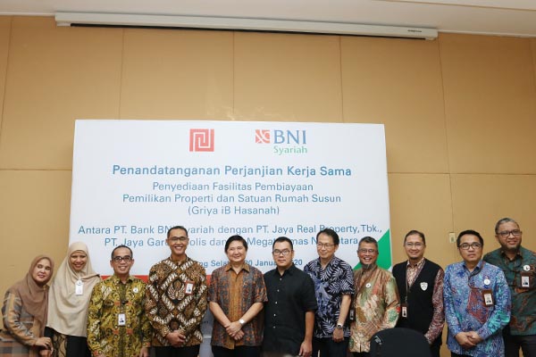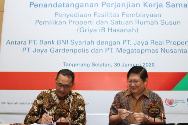 SEVP Bisnis Ritel dan Jaringan BNI Syariah Iwan Abdi (kiri) berbincang dengan Direktur PT Jaya Gardenpolis, Johanes Mardjuki, Direktur PT Jaya Real Property Tbk, Djuniardi Christanto dan Direktur PT Megatopmas Nusantara, Subianto Setjawardaja (kiri ke kanan) usai melakukan penandatangan kerjasama terkait penyediaan fasilitas pembiayaan pemilikan properti dan satuan rumah susun (BNI Griya iB Hasanah) di kantor PT Jaya Real Property, Tangerang Selatan, Banten, Kamis 30 Januari 2020. Dalam kerjasama ini, BNI Syariah menyediakan fasilitas pembiayaan kepemilikan rumah (BNI Griya iB Hasanah) bagi masyarakat yang ingin memiliki hunian dengan sistem syariah. Ada beberapa pilihan hunian yaitu rumah, rukan, ruko yang merupakan proyek dari PT Jaya Gardenpolis dan PT Megatopmas Nusantara serta apartemen yang merupakan proyek dari PT Jaya Real Property Tbk.