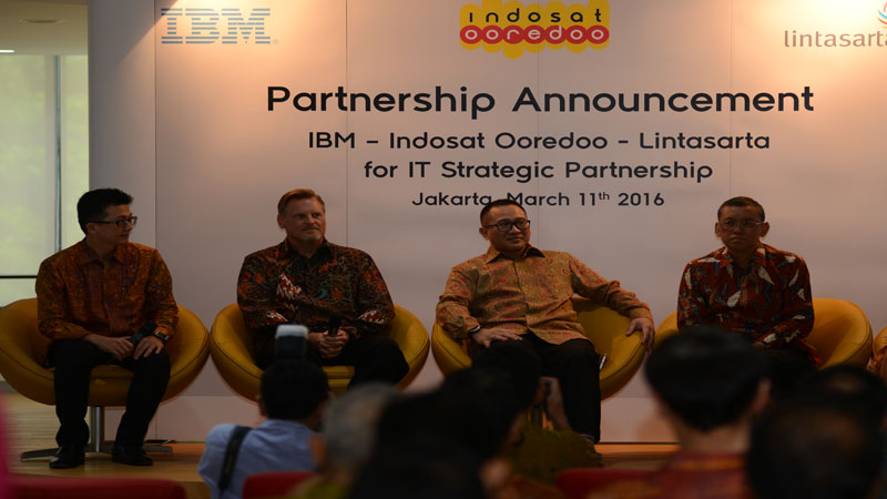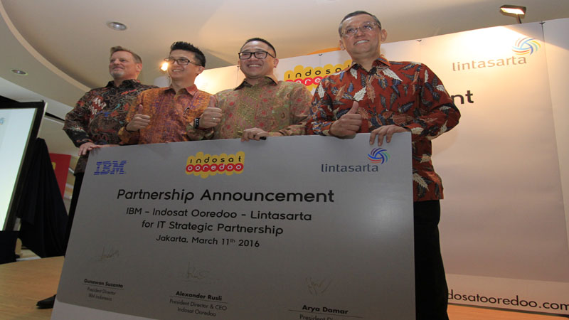 President Director Lintasarta Arya Damar, President Director & CEO Indosat Ooredoo (dua kanan), President Director IBM Indonesia Gunawan Susanto, Chairman and CEO IBM Asia Pacific (kanan-kiri) berfoto bersama usai penandatanganan kerjasama IT Strategic Partnership antara Indosat Ooredoo, Lintasarta dan IBM di Jakarta, Jumat 11 Maret 2016. Kerjasama tersebut untuk memberikan solusi IT bagi perusahaan-perusahaan di Indonesia. Kemitraan strategis berjangka lima tahun ini mengantisipasi nilai target bersama sebesar 200 juta USD, dalam menyediakan serangkaian solusi IT bagi perusahaan dan bisnis di Indonesia. (erman subekti)