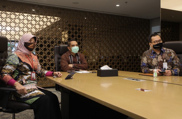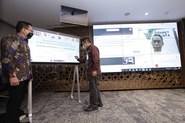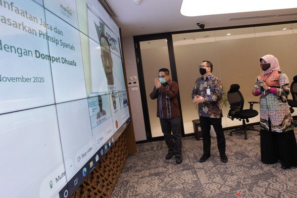 Direktur Distribution & Sales Mandiri Syariah Anton Sukarna (kanan), bersama Group Head Sales and Partnership Mandiri Syariah Riko Wardhana (tengah), dan Dept. Head Wholesale and Institutional Banking Group Erry Susilowati (kiri) serta Ketua Yayasan Dompet Dhuafa Nasyith Majidi (dalam screen) saling menyapa melalui media digital pasca penandatanganan kerjasama layanan zakat, infak, sedekah, wakaf (ziswaf) dalam berbagai platform di Jakarta, Jumat 6 November 2020. Mandiri Syariah berkolaborasi dengan Dompet Dhuafa dalam memaksimalkan potensi ziswaf dan mendukung program pemerintah untuk pengembangan ekosistem syariah di Indonesia.
