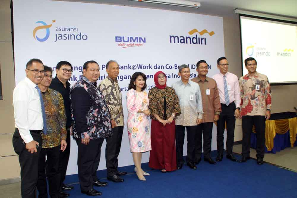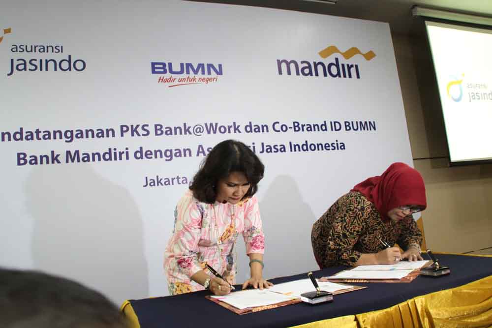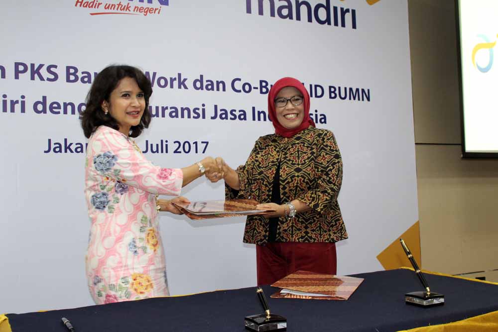 Direktur government and Institutional Bank Mandiri Kartini Sally dan Direktur Utama Jasindo Solihah bertukar cenderamata usai menandatangani kerjasama layanan perbankan dan ID Card co-branding e-money di Jakarta, Selasa, 11 Juli 2017. Melalui ID Card co branding tersebut, karyawan Jasindo dapat memanfaatkan untuk berbagai transaksi non tunai layanan sehari-hari seperti di tol Jabodetabek, busway, retail merchant, SPBU, secure parking, bahkan produk KPR, KTA dan tempat rekreasi. Di samping ID Card co branding, bank Mandiri juga menyiapkan produk consumer banking dengan rate khusus bagi karyawan Jasindo.