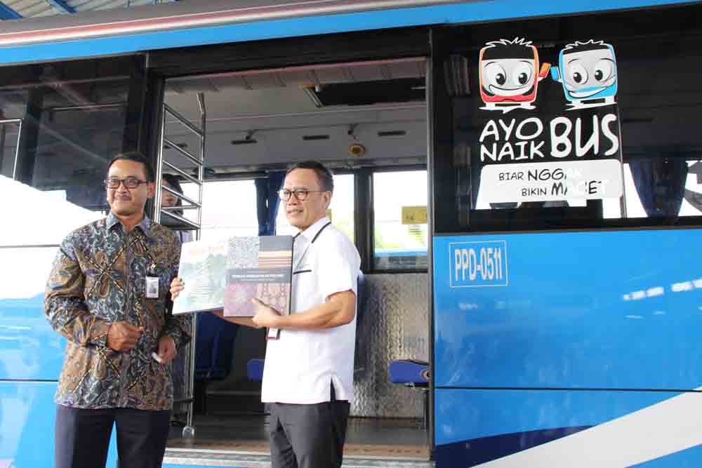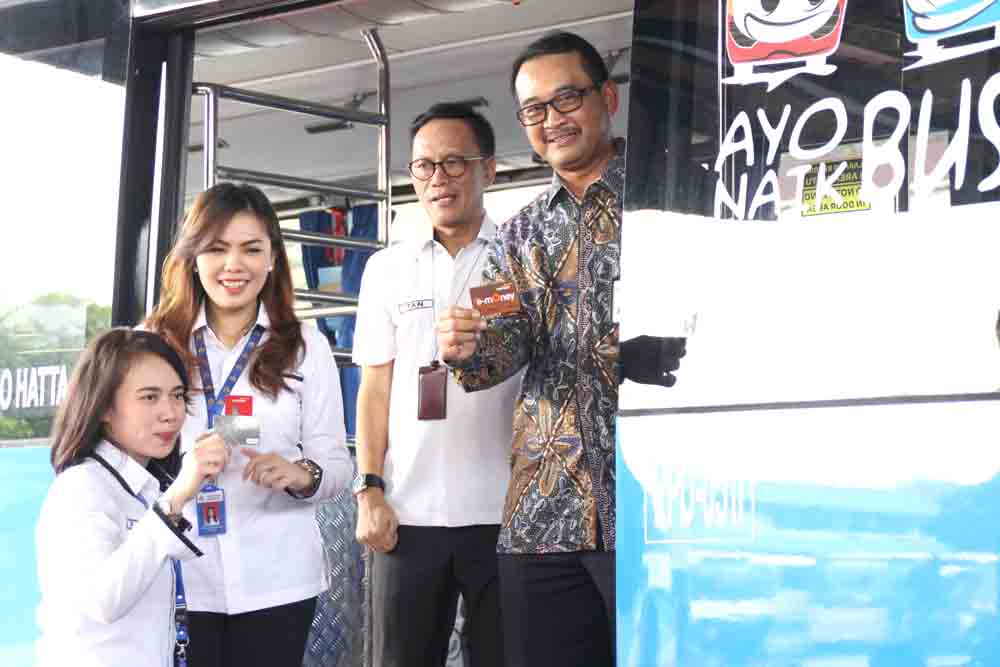 Dirut Perum Pengangkutan Penumpang Djakarta (PPD) Tatan Rustandi (kedua kanan) dan EVP Government & Institutional Bank Mandiri M Arifin Firdaus (kanan) sedang berbincang di dalam Bis JA Connexion di kantor SBU Pemeliharaan PPD Ciputat, Tangerang Selatan, Banten, Selasa 11 Juli 2017. Bank Mandiri menyiapkan layanan perbankan komprehensif untuk meningkatkan efisiensi pengelolaan keuangan Perum PPD, antara lain melalui pemasangan sistem pembayaran non tunai dengan menggunakan kartu Mandiri e-money pada armada bus Perum PPD.(Budi Urtadi)