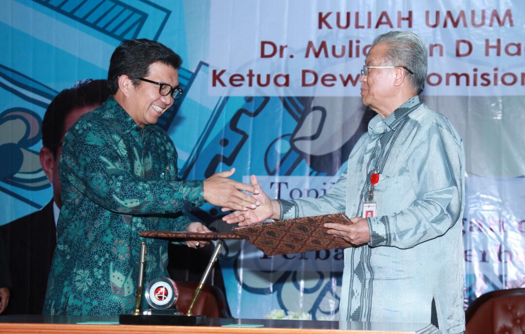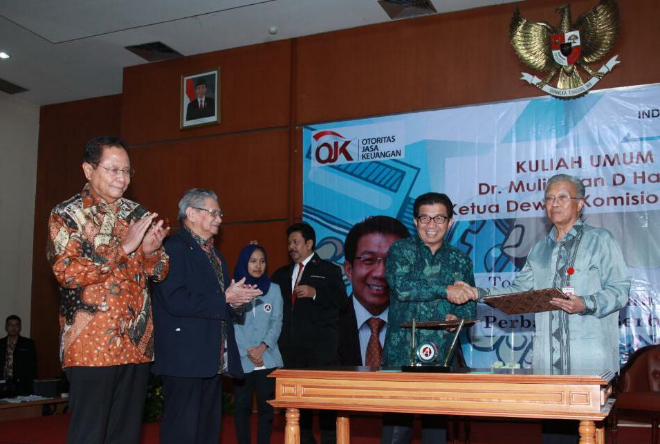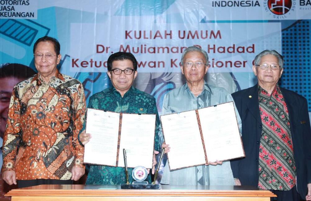Ketua Dewan Komisioner Otoritas Jasa Keuangan (OJK), Muliaman D. Hadad (kiri) bersama Ketua STIE Indonesia Banking School, Subarjo Joyosumarto (kanan) melakukan pertukaran nota kesepahaman yang telah ditandatanganani antara Otoritas Jasa Keuangan (OJK) dengan STIE Indonesia Banking School (STIE IBS) di Jakarta, Jumat 2 Juni 2017. Nota kesepahaman tersebut dalam rangka kerjasama pengembangan sektor jasa keuangan, peningkatan literasi keuangan dan perlindungan konsumen. Ruang lingkup nota kesepahaman ini, meliputi penelitian, pengajaran, dan pengabdian kepada masyarakat dalam rangka pengembangan sektor jasa keuangan, peningkatan Literasi keuangan dan perlindungan konsumen.(Erman Subekti)