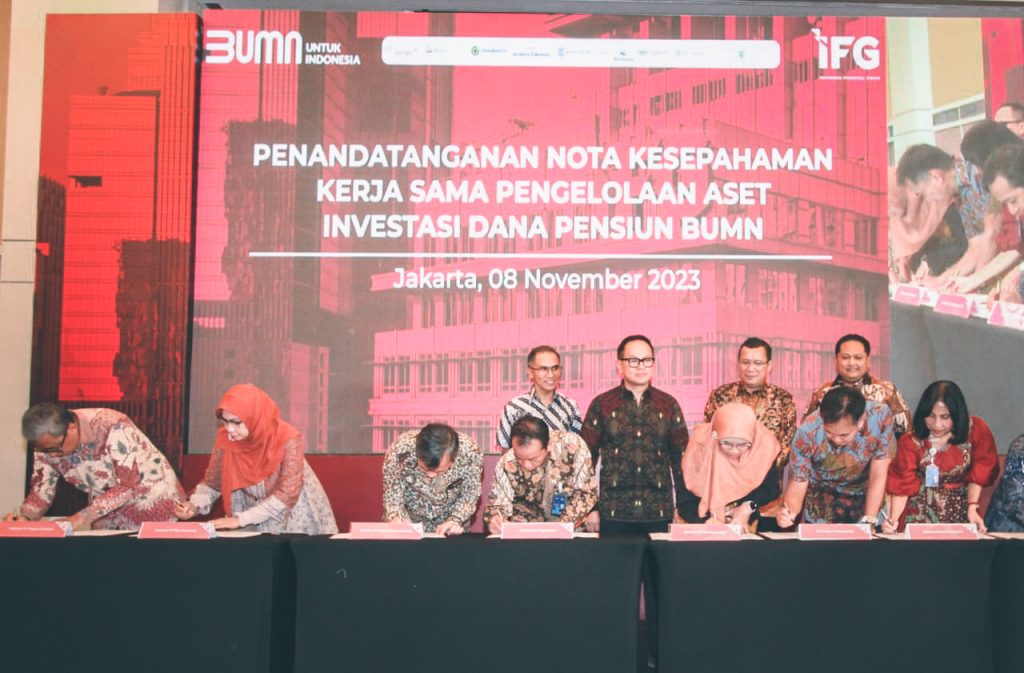 Mereka hadir seusai melakukan penandatanganan kerjasama antara IFG dengan 10 BUMN Pendiri Dana Pensiun BUMN dalam rangka Kerja Sama Pengelolaan Aset Investasi Dana Pensiun.