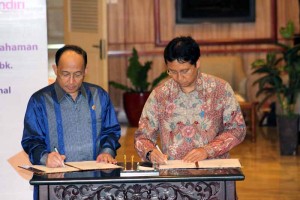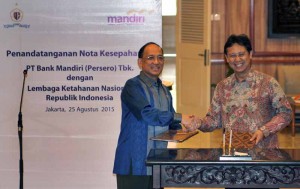 Gubernur Lemhanas,Budi Susilo Soepandji dan Direktur Utama Bank Mandiri Budi G. Sadikin tengah berbincang usai penandatanganan nota kesepahaman di Gedung Lemhanas RI, Jakarta, Selasa 25 Agustus 2015. Bank Mandiri bekerjasama dengan Lemhanas dalam meningkatkan kualitas SDM melalui pendidikan dan pelatihan, pertukaran tenaga ahli dan pemantapan nilai-nilai kebangsaan. Dalam kerjasama ini, Bank Mandiri dan Lemhanas juga akan saling bertukar informasi dalam rangka pengukuran ketahanan nasional, pelaksanaan pengkajian dan bidang lain sesuai kebutuhan dengan tetap memperhatikan ketentuan peraturan perundang-undangan yang berlaku termasuk ketentuan kerahasiaan bank.(Budi Urtadi)