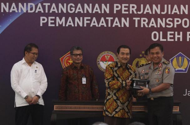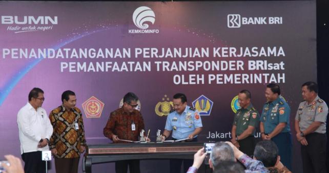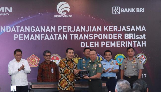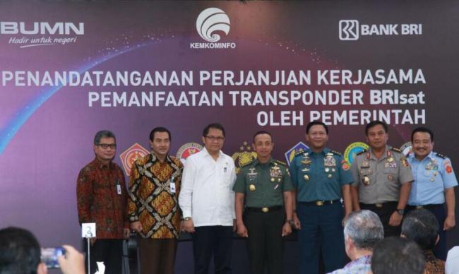 Direktur Utama Bank BRI Suprajarto (kedua kiri) dan Menteri Komunikasi dan Informatika Rudiantara (kiri) menyaksikan Wakil Direktur Utama Bank BRI Sunarso (ketiga kiri) yang tengah melakukan penandatanganan kerjasama pemanfaatan transponder BRIsat dengan Lembaga Negara yakni Polri, Markas Besar Tentara Nasional Indonesia, Badan Intelijen Negara, Badan Keamanan Laut dan Kementerian Keuangan di Jakarta, Rabu, 7 Juni 2017. Bank BRI, di bawah koordinasi Kemkominfo sebagai regulator di bidang telekomunikasi memberikan 4 transponder BRIsat yang terdiri dari 2 transponder C-band dan 2 transponder Ku-band, masing masing setara 36 MHz kepada Kementerian dan Lembaga Negara untuk mendukung kepentingan negara.