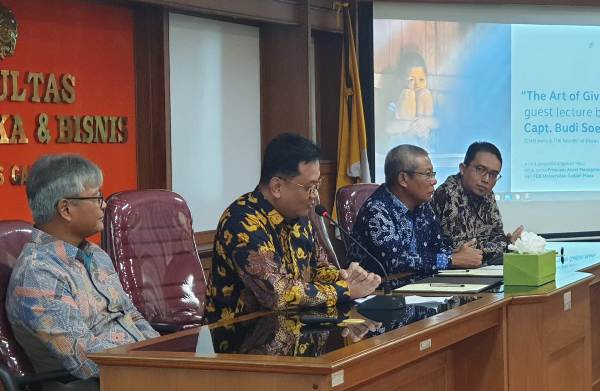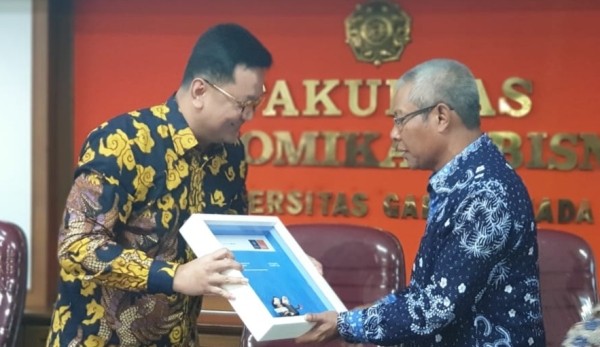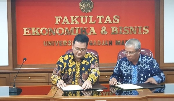 CEO Principal Asset Management Agung Budiono (kiri) dan Dekan Fakultas Ekonomika dan Bisnis Universitas Gadjah Mada, Eko Suwardi, Ph.D.,bertukar naskah usai menandatangani Nota Kesepahaman di kampus Universitas Gadjah Mada (UGM), Yogyakarta, Selasa, 17 Maret 2020. Kerjasama ini adalah kolaborasi pertama antara perusahaan Manajemen Investasi dan UGM, dalam membentuk Center of Excellence. Hal ini dilakukan untuk membagi ilmu dan pengalaman dalam bidang investasi syariah, impact investment, serta program magang dengan para mahasiswa UGM. Para mahasiswa peserta program akan dididik menjadi akademisi yang tidak hanya unggul dalam bidang keuangan dan investasi, namun juga memiliki empati, wawasan global, serta perspektif yang maju.