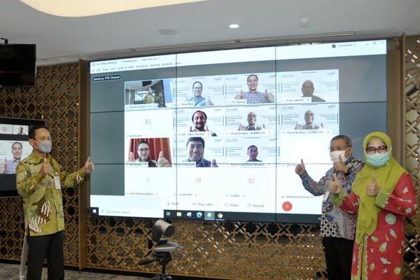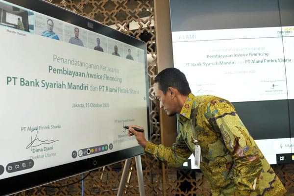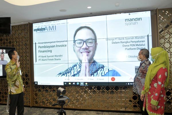 Senior Executive Vice President (SEVP) Mandiri Syariah Wawan Setiawan (kiri), Group Head Mandiri Syariah Okky Fachrizal Achmad (tengah), Area Manager Mandiri Syariah Metty Purwitasari (kanan) menyapa Founder dan CEO ALAMI Dima Djani (di layar) setelah penandatanganan kerjasama secara virtual di Jakarta, Kamis 15 Oktober 2020. Mandiri Syariah berkolaborasi dengan PT Alami Fintek Sharia dalam penyaluran pembiayaan syariah untuk UMKM khususnya dalam hal pencairan dana. Kolaborasi ini merupakan bentuk komitment dalam mendukung program Pemerintah dalam Pemulihan Ekonomi Nasional (PEN).