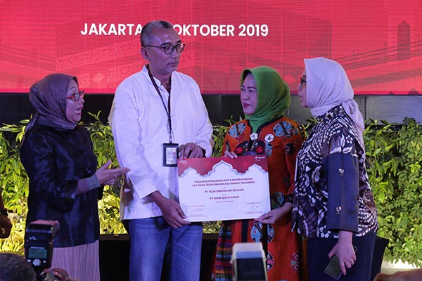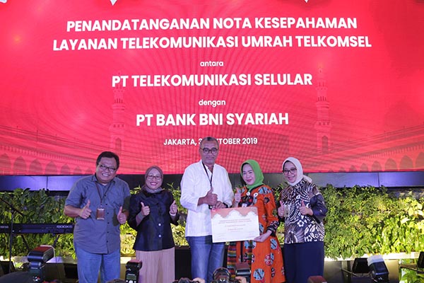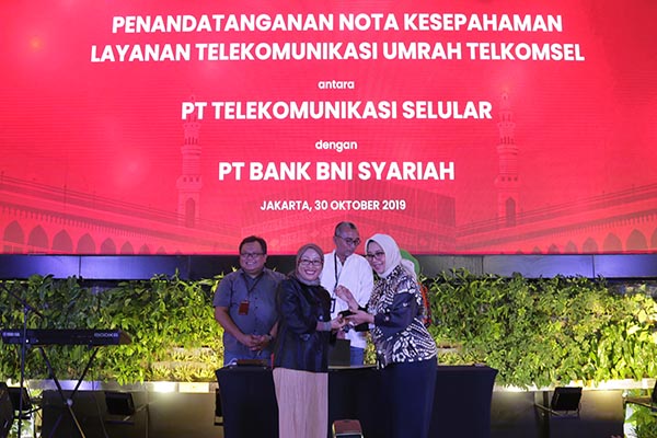 Direktur Sales Telkomsel Ririn Widaryani, VP Sales & Care Strategy Telkomsel Andri Wibawanto, Pemimpin Divisi Haji dan Umrah BNI Syariah Ida Triana Widowati dan Direktur Bisnis SME & Komersial BNI Syariah, Dhias Widhiyati (dari kiri ke kanan) saat acara penandatangan nota kesepahaman (Memorandum of Understanding) dengan PT Telekomunikasi Selular (Telkomsel) terkait penyelenggaraan paket ibadah umroh di Jakarta, Kamis, 30 Oktober 2019. Paket ini merupakan bundling perjalanan ibadah umroh dengan layanan telekomunikasi roaming telepon dan internet Telkomsel. Melalui kolaborasi dengan Telkomsel dan perusahaan travel, BNI Syariah siap menyediakan layanan umroh yang terbaik sesuai prinsip 5 pasti umroh. Prinsip 5 pasti umroh ini adalah pasti jadwal keberangkatan, pasti izin PPIU (Penyelenggara Perjalanan Ibadah Umroh), pasti pesawat, pasti hotel dan pasti visa.
