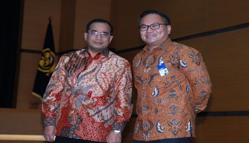 Menteri Perhubungan, Budi Karya Sumadi dan Dirut Bank Mandiri Kartika Wirjoatmodjo tengah berbincang usai penandatanganan perjanjian kerjasama transaksi Penerimaan Negara Bukan Pajak (PNBP) di Gedung Kementerian Perhubungan Jakarta, Senin 23 Januari 2017. Melalui kerjasama ini, para wajib bayar/pengguna jasa di Kemenhub akan dapat melakukan pembayaran atas fasilitas atau manfaat yang diperoleh melalui Mandiri Internet Banking, ATM, EDC, serta kantor cabang. Kerjasama ini merupakandukungan perseroan kepada Kemenhub dalam menciptakan sistem penerimaan negara yang transparan, akuntabel, dan sejalan dengan implementasi Modul Penerimaan Negara Generasi Kedua.
