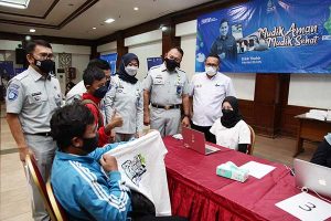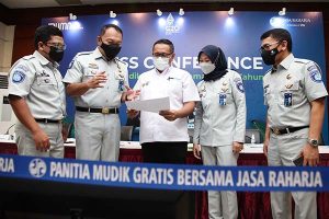 Direktur Utama Asuransi Jasa Raharja Rivan A. Purwantono (kanan) bersama Asisten Deputi Bidang Tanggung Jawab Sosial dan Lingkungan Kementerian BUMN Edi Eko Cahyono (tengah) dan Direktur Operasional Asuransi Jasa Raharja Dewi Aryani Suzana (kiri) tengah melihat peta rute bus mudik Jasa Raharja di sela acara update Mudik Aman dan Mudik Sehat Bersama BUMN 2022 di Jakarta, Rabu, 20 April 2022. Jasa Raharja bekerja sama dengan Korlantas Polri, Kementrian Perhubungan, hingga Kementrian PUPR untuk melancarkan Mudik Aman dan Mudik Sehat Bersama BUMN 2022 menyiapkan 2.000personel. Selain itu Jasa Raharja juha menyiagakan pos pendukung kesehatan terpadu di 60 lokasi, mobil unit keselamatan lalu lintas di 60 titik cabang, pos pelayanan rest area di 12 titik lokasi, pemasangan rambu pengingat di 5.000 titik lokasi, serta distribusi sarana keselamatan sebanyak 6.000 unit.