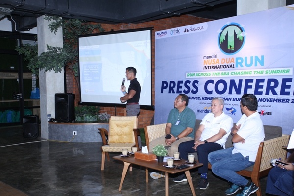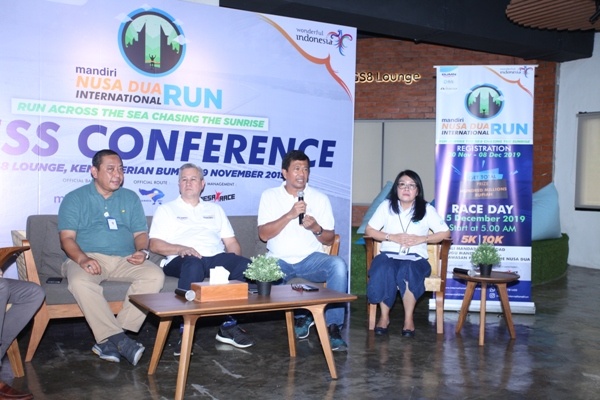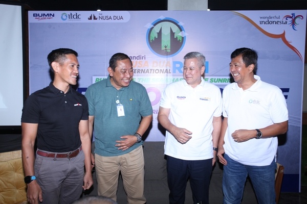 Direktur Konstruksi & Operasi PT Pengembangan Pariwisata Indonesia (Persero) / Indonesia Tourism Development Corporation (ITDC) Ngurah Wirawan (kanan), bersama Corporate Secretary PT Bank Mandiri (Persero) Tbk Rohan Hafas (kedua kanan), Direktur Utama PT Jasa Marga Bali Tol Enkky Sasono Anas Wijaya (kedua kiri) dan CEO Mesa Race selaku Race Director Reza Pusponegoro berbincang seusai press conference kick off Mandiri Nusa Dua International Run 2019 (Mandiri NDIR’19) di Jakarta, Jumat 29 November 2019. Mandiri NDIR tahun ini mengusung tema “Run Across The Sea – Chasing The Sunrise” serta konsep Fun and Culture yang akan kembali digelar pada tanggal 15 Desember 2019 di kawasan The Nusa Dua, Badung, Bali dengan mempertandingkan 2 kategori lari yaitu 10 km (10K) dan 5 km (5K) dan ditargetkan dapat diikuti 1200 pelari dari kalangan profesional dan pemula baik yang berasal dari mancanegara maupun domestik.