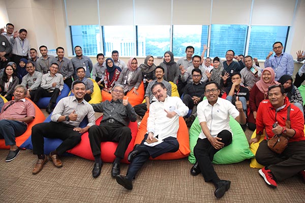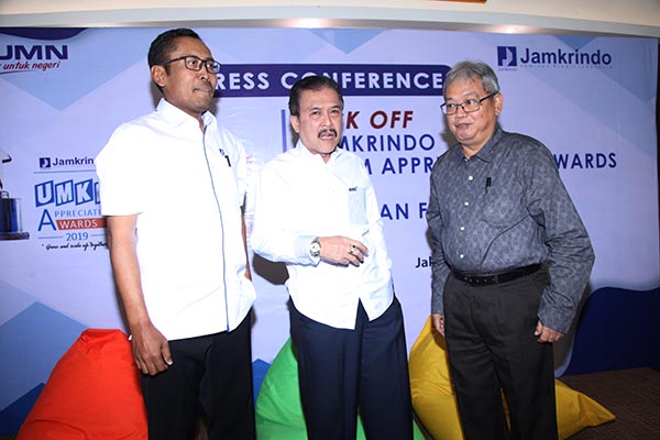 Direktur Utama Perum Jamkrindo, Randi Anto (tengah) berbincang-bincang bersama dengan Direktur Keuangan, Investasi, dan Manajemen Risiko I Rusdonobanu (kanan) Direktur Bisnis Penjaminan Amin Mas’udi (kiri) sebelum menyampikan paparannya mengenai Penyelenggaraan UMKM Appreciation Awards dan Festival UMKM yang bertujuan untuk memberikan apresiasi kepada UMKM terjamin Perum Jamkrindo, di Jakarta, Selasa 26 November 2019. Kegiatan ini dilaksanakan sekaligus untuk menguatkan peran dan fungsi Perum Jamkrindo sebagai satu-satunya BUMN di bidang penjaminan UMKM.