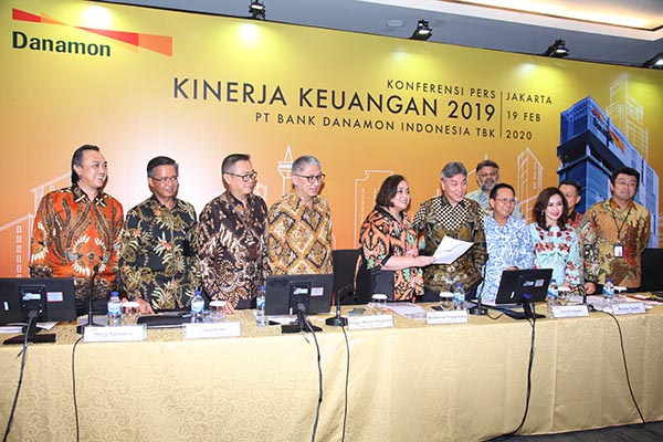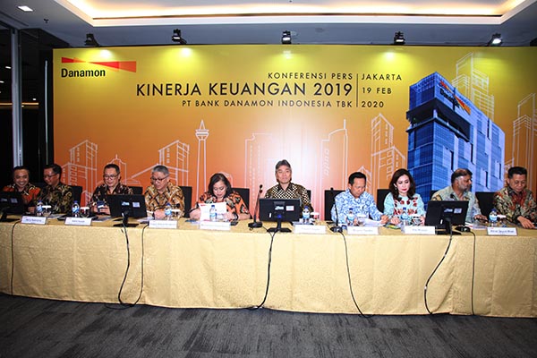 Direktur Utama Bank Danamon Yasushi Itagaki (tengah) didampingi direksi lainnya tengah memberikan paparan kinerja keuangan tahun 2019 kepada awak media, yang dilakukan di Jakarta, Rabu, 19 Februari 2020. Bank Danamon membukukan laba bersih setelah pajak (NPAT) sebesar Rp 4,07 triliun pada tahun 2019, atau tumbuh 4% dari tahun sebelumnya. Pertumbuhan NPAT ini dikontribusikan oleh penuntasan transaksi penjualan 70% kepemilikan saham di PT Asuransi Adira Dinamika Tbk anak perusahaan Bank Danamon yang bergerak di segmen asuransi umum, kepada Zurich Insurance Company Ltd, perusahaan asuransi umum terkemuka di dunia.