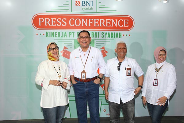 Plt. Direktur Utama PT Bank BNI Syariah Abdullah Firman Wibowo (kedua kiri), memberikan paparan didampingi Direktur Bisnis Dhias Widhiyati (dari kiri), Direktur Operasional Junaidi Hisom, dan Direktur Kepatuhan & Risiko Tribuana Tunggadewi, saat konferensi pers kinerja perseroan di Jakarta, Selasa 27 Februari 2018.