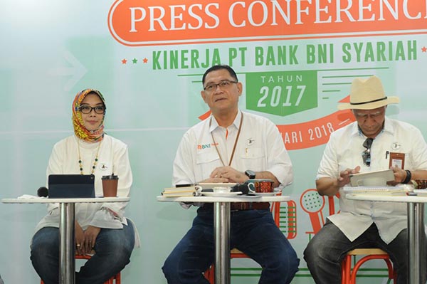 Plt. Direktur Utama PT Bank BNI Syariah Abdullah Firman Wibowo (tengah), memberikan paparan didampingi Direktur Bisnis Dhias Widhiyati (kiri), Direktur Operasional Junaidi Hisom (kanan), saat konferensi pers kinerja perseroan di Jakarta, Selasa 27 Februari 2018.