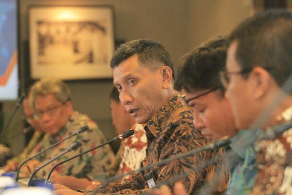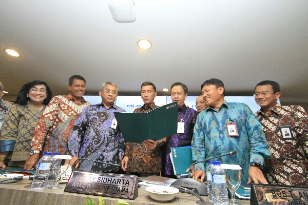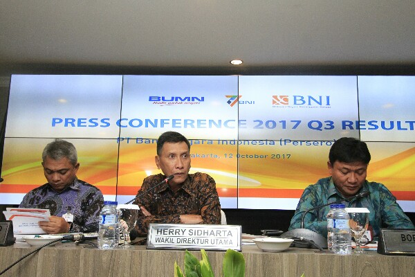 Wakil Direktur Utama PT Bank Negara Indonesia (Persero) Tbk (BNI), Herry Sidharta (tengah) bersama jajaran direksi perseroan dalam paparan kinerja kuartal III-2017 kepada wartawan di Gedung BNI, Jakarta, Kamis, 12 Oktober 2017.