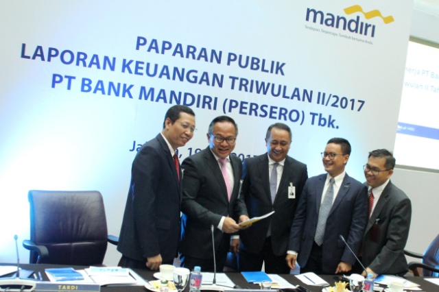 (Kiri-kanan) Direktur Retail Banking Bank Mandiri Tardi, Direktur Utama Bank Mandiri Kartika Wirjoatmodjo, Direktur Wholesale Banking Bank Mandiri Royke Tumilaar, Direktur Risk Management & Compliance Bank Mandiri Ahmad Siddik Badruddin dan Direktur Digital Banking & Technology Bank Mandiri Rico Usthavia Frans tengah berbincang usai pemaparan kinerja Bank Mandiri Triwulan II/2017 di Jakarta, Rabu 19 Juli 2017. Melanjutkan tren pertumbuhan positif di tahun ini perseroan membukukan pertumbuhan kredit secara yoy sebesar 11,6% pada akhir Juni 2017 menjadi Rp682,0 triliun. Sehingga pada triwulan II – 2017 ini perseroan mencatat laba bersih sebesar Rp 9,5 triliun atau tumbuh 33,7% (yoy).(Budi Urtadi)