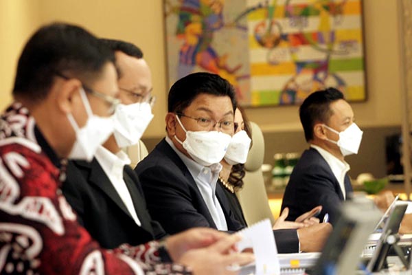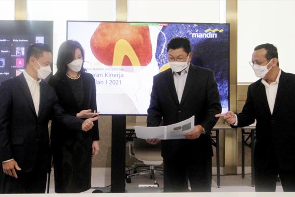 Direktur Keuangan & Strategi Bank Mandiri Sigit Prastowo, Direktur Utama Bank Mandiri Darmawan Junaidi, Wakil Direktur Utama Bank Mandiri Alexandra Askandar dan Direktur Management Risiko Bank Mandiri Ahmad Siddik Badruddin saat menyampaikan paparan kinerja triwulan I-2021 di Jakarta, Selasa, 27 April 2021. Konsistensi Bank Mandiri untuk menggarap bisnis secara sustain dan prudent mendorong pertumbuhan kredit konsolidasian yang solid di kisaran 9,1% secara yoy menjadi Rp984,4 triliun pada triwulan I-2021. Pencapain tersebut teetap memeperhatikan kualitas pembiayaan sehingga rasio NPL konsolidasi terjaga baik dikisaran 3,15% dan rasio pencadangan terhadap NPL lebih dari 220%.
