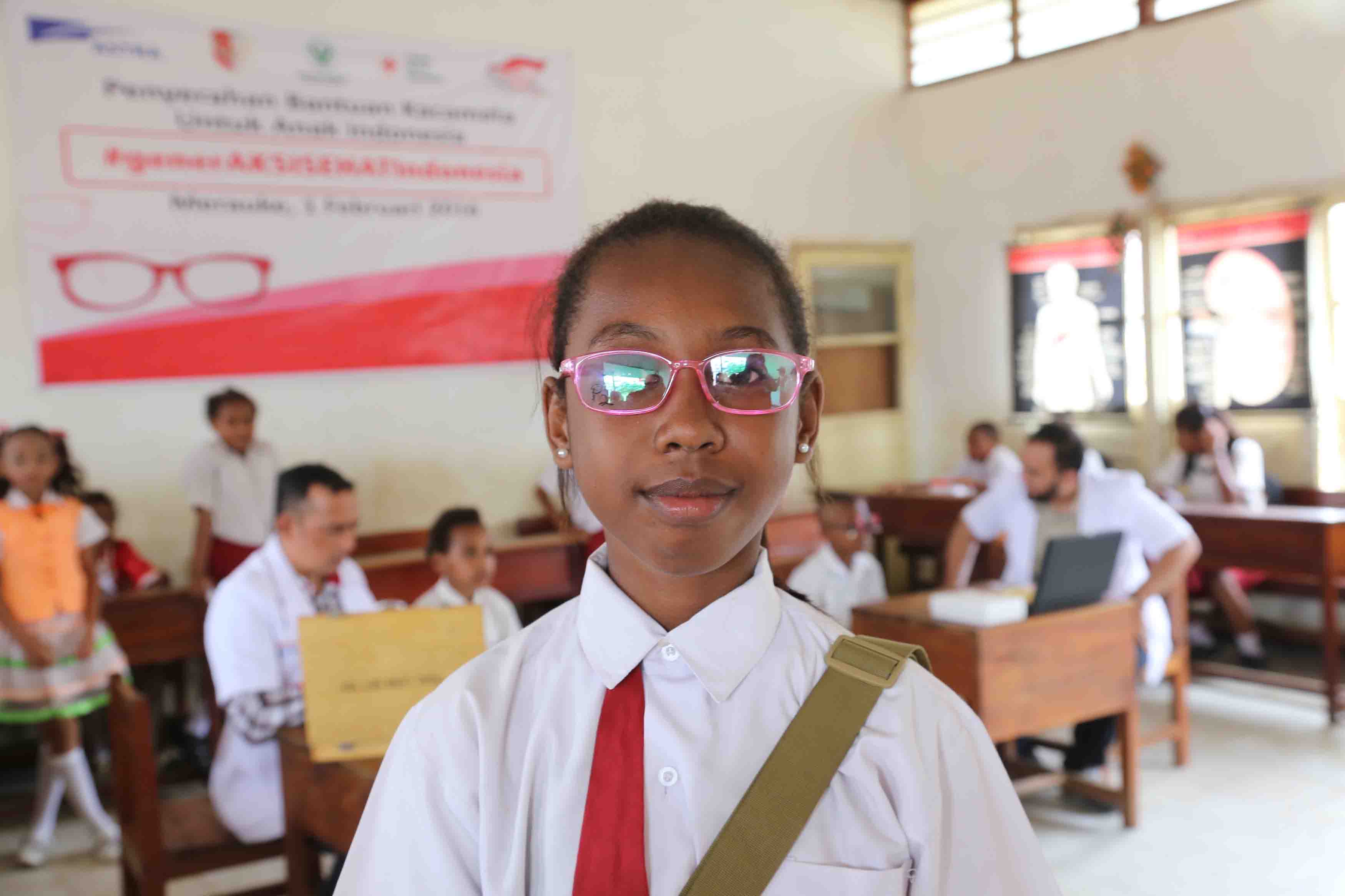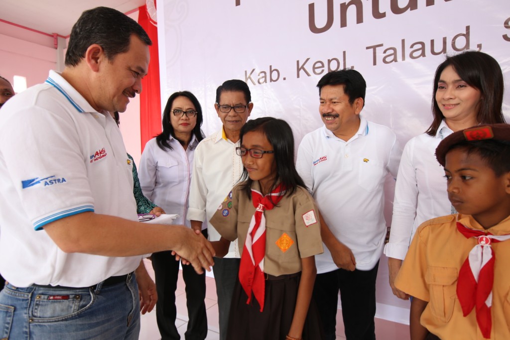 Bupati Talaud Sri Wahyuni Maria Manalip (berdiri ketiga kiri), Ketua PMI Sulawesi Utara Annie Dondokambey (berdiri kedua kiri), Kepala Divisi Kesehatan Rumah Sakit dan Sosial PMI Pusat dr. Arfan, serta perwakilan Astra, Head of Environment & Social Responsibility Division Riza Deliansyah (berdiri kanan) dan Head of Public Relations Division Yulian Warman, menyaksikan Siswa SDN 1 Beo, Kepulauan Talaud, Sulawesi Utara, mendapatkan pemeriksaan mata gratis oleh Palang Merah Indonesia (PMI) di Kepulauan Talaud Sulut, Jumat 21 Januari 2017. Sebanyak 2.000 kacamata kembali diserahkan Astra bagi anak-anak di kawasan paling utara Indonesia Timur, tepatnya di Kabupaten Kepulauan Talaud, Sulawesi Utara.(*)